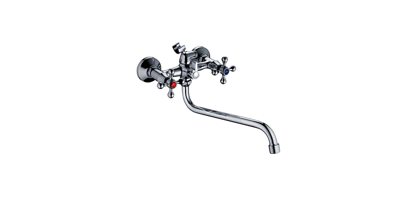 Смеситель позволяет регулировать поток воды и получать воду требуемой температуры при смешивании горячей и холодной воды. Смеситель имеет две ручки для регулирования подачи воды, а также душевой шланг с лейкой.